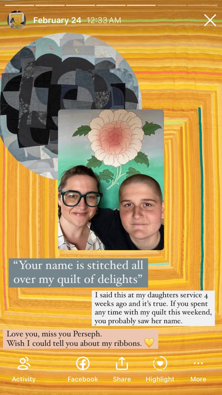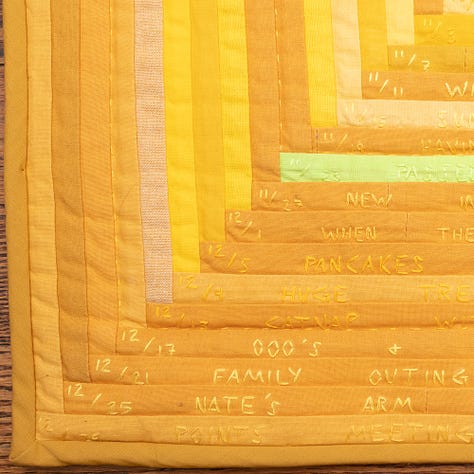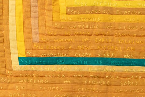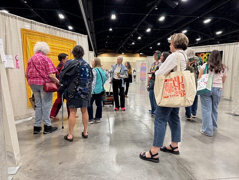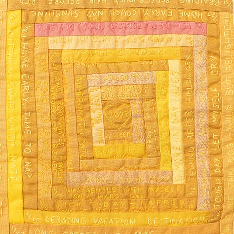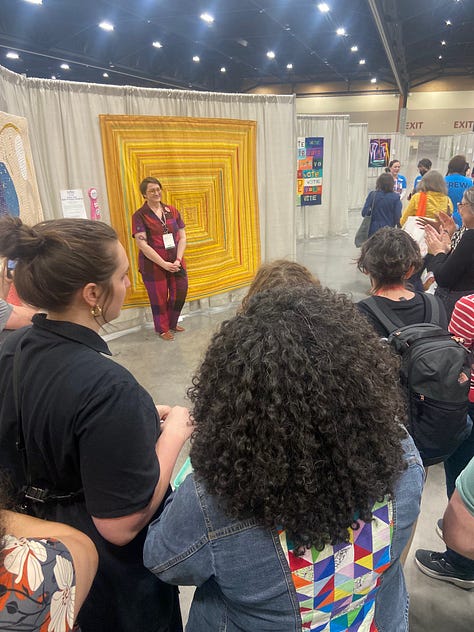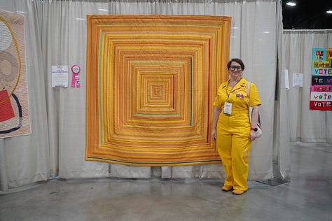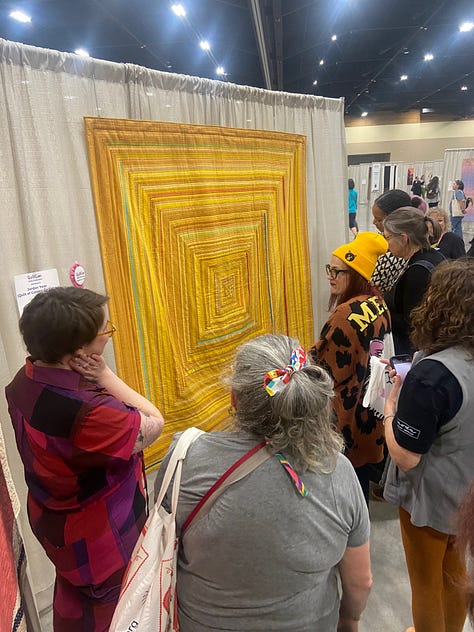 I had a big, bittersweet weekend at QuiltCon this year. I knew when I went that I was getting an award, my first judge’s award, which was exciting. Third place in the handwork category for my gold log cabin quilt covered in hand embroidered words. My other quilt in the show didn’t win a ribbon but it did get invited to travel with the exhibit that will be shown in multiple states and countries. Also exciting. I taught 4 classes, my first time teaching at QuiltCon. And I gave a lecture which went well from my perspective, and got a lot of positive feedback from attendees. Then on Sunday I found out my gold log cabin won People’s Choice, a huge honor. Ten years after winning it for my Goodnight quilt. I’m the first person in QuiltCon history to win this award twice. I always try to temper my expectations but I worked really hard on that quilt and I felt like it was special. So the recognition felt good. Lots of smiles, laughs with my friends, hugs, and accolades.